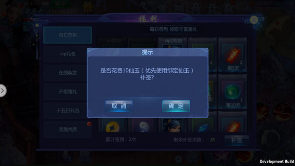 【每日签到】道友每天登陆都可以获得相应的奖励,有机会获得伙伴碎片,金币哦~如果道友某天忘记签到了,可以花费一定的仙玉进行补签,当然要是有多天忘了,要一天天补签的哦,不可以跳天数。