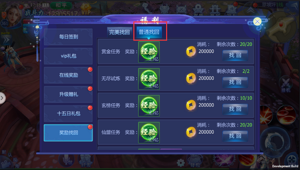 【奖励找回】这是个极其人性化的福利系统,道友们要是前一天来不及完成所有任务,那么就可以通过这个系统来找回那些未拿到的将哦。这个系统分为两部分,一个是完美没找回,通过消耗一定的仙玉数量可以前一天该活动的所有奖励,包括经验、物品、积分等等,普通找回则是通过消耗铜钱来找回前一天的部分奖励。
